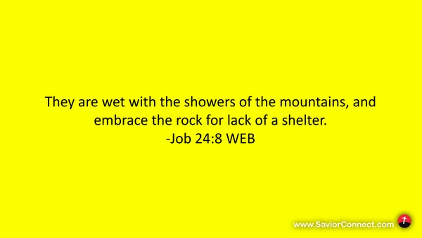 They are wet with the showers of the mountains, and embrace the rock for lack of a shelter. -Job 24:8 WEB