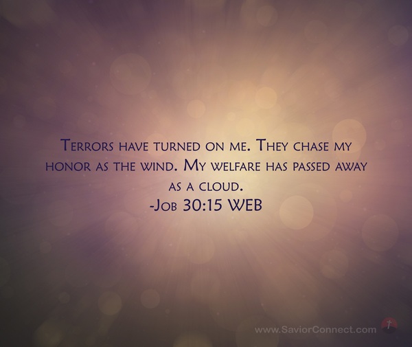 Terrors have turned on me. They chase my honor as the wind. My welfare has passed away as a cloud. -Job 30:15 WEB