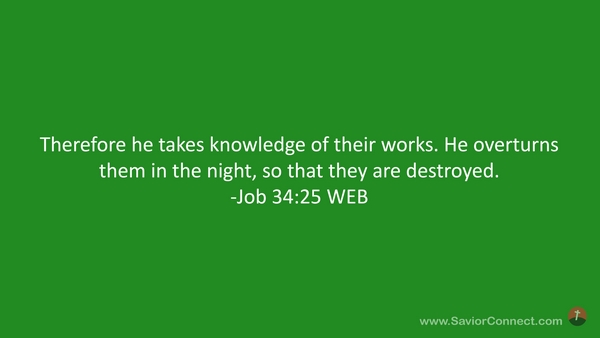 Therefore he takes knowledge of their works. He overturns them in the night, so that they are destroyed. -Job 34:25 WEB