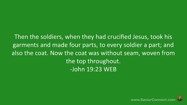 Then the soldiers, when they had crucified Jesus, took his garments and made four parts, to every soldier a part; and also the coat. Now the coat was without seam, woven from the top throughout. -John 19:23 WEB