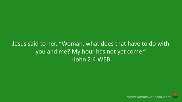 Jesus said to her, “Woman, what does that have to do with you and me? My hour has not yet come.” -John 2:4 WEB