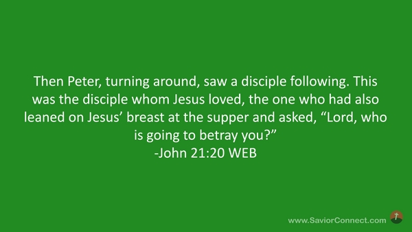 Then Peter, turning around, saw a disciple following. This was the disciple whom Jesus loved, the one who had also leaned on Jesus’ breast at the supper and asked, “Lord, who is going to betray you?” -John 21:20 WEB