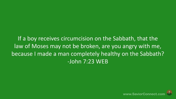 If a boy receives circumcision on the Sabbath, that the law of Moses may not be broken, are you angry with me, because I made a man completely healthy on the Sabbath? -John 7:23 WEB