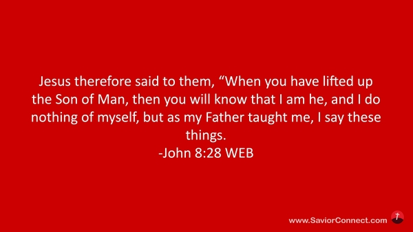 Jesus therefore said to them, “When you have lifted up the Son of Man, then you will know that I am he, and I do nothing of myself, but as my Father taught me, I say these things. -John 8:28 WEB