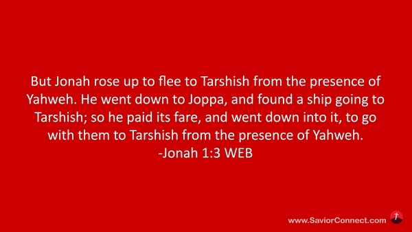 But Jonah rose up to flee to Tarshish from the presence of Yahweh. He went down to Joppa, and found a ship going to Tarshish; so he paid its fare, and went down into it, to go with them to Tarshish from the presence of Yahweh. -Jonah 1:3 WEB