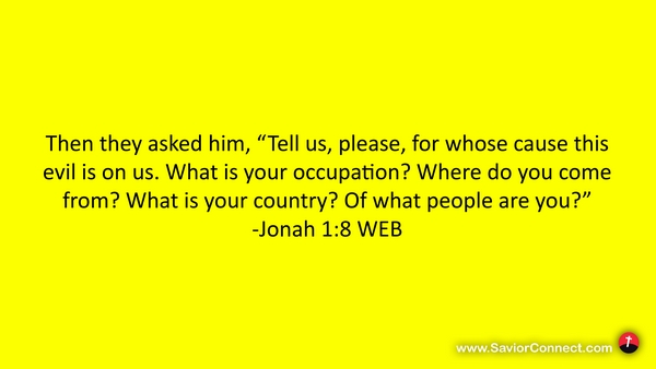 Then they asked him, “Tell us, please, for whose cause this evil is on us. What is your occupation? Where do you come from? What is your country? Of what people are you?” -Jonah 1:8 WEB