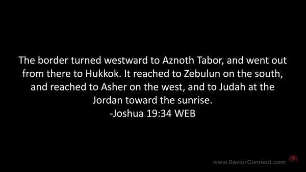 The border turned westward to Aznoth Tabor, and went out from there to Hukkok. It reached to Zebulun on the south, and reached to Asher on the west, and to Judah at the Jordan toward the sunrise. -Joshua 19:34 WEB