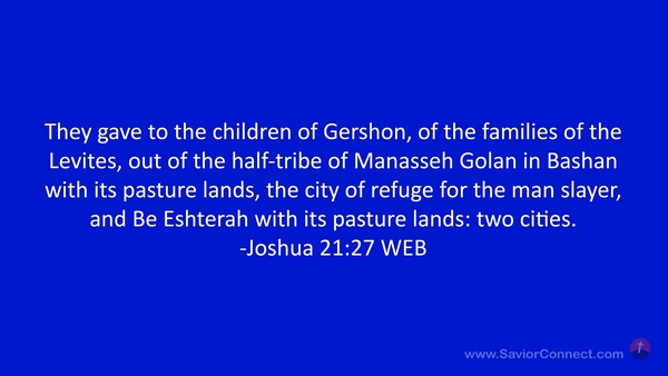 They gave to the children of Gershon, of the families of the Levites, out of the half-tribe of Manasseh Golan in Bashan with its pasture lands, the city of refuge for the man slayer, and Be Eshterah with its pasture lands: two cities. -Joshua 21:27 WEB