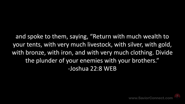 and spoke to them, saying, “Return with much wealth to your tents, with very much livestock, with silver, with gold, with bronze, with iron, and with very much clothing. Divide the plunder of your enemies with your brothers.” -Joshua 22:8 WEB