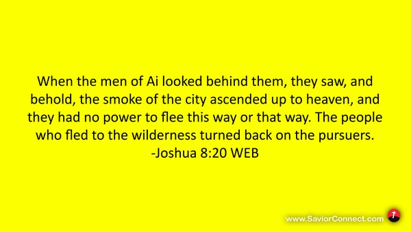 When the men of Ai looked behind them, they saw, and behold, the smoke of the city ascended up to heaven, and they had no power to flee this way or that way. The people who fled to the wilderness turned back on the pursuers. -Joshua 8:20 WEB