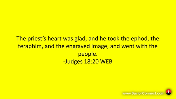 The priest’s heart was glad, and he took the ephod, the teraphim, and the engraved image, and went with the people. -Judges 18:20 WEB