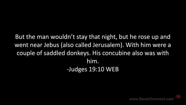 But the man wouldn’t stay that night, but he rose up and went near Jebus (also called Jerusalem). With him were a couple of saddled donkeys. His concubine also was with him. -Judges 19:10 WEB