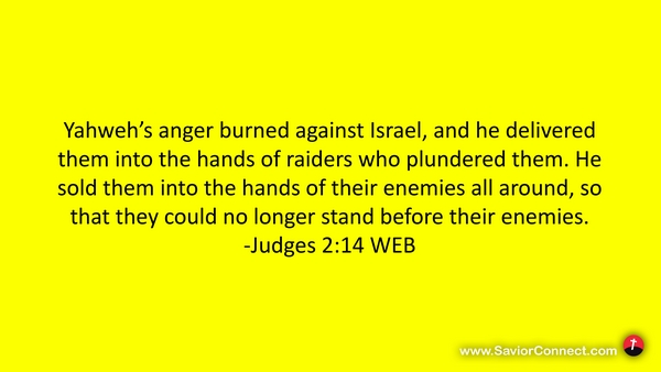 Yahweh’s anger burned against Israel, and he delivered them into the hands of raiders who plundered them. He sold them into the hands of their enemies all around, so that they could no longer stand before their enemies. -Judges 2:14 WEB