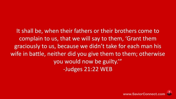 It shall be, when their fathers or their brothers come to complain to us, that we will say to them, 'Grant them graciously to us, because we didn’t take for each man his wife in battle, neither did you give them to them; otherwise you would now be guilty.’” -Judges 21:22 WEB