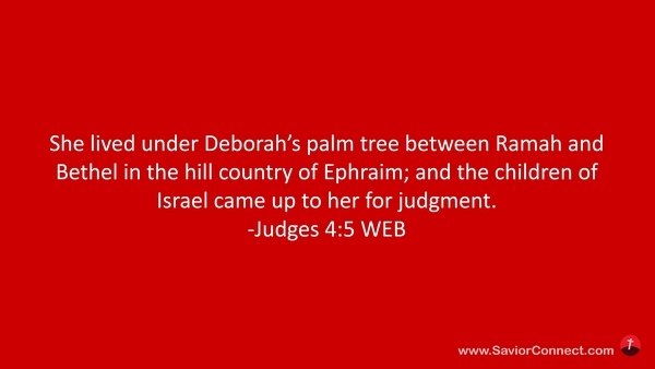 She lived under Deborah’s palm tree between Ramah and Bethel in the hill country of Ephraim; and the children of Israel came up to her for judgment. -Judges 4:5 WEB