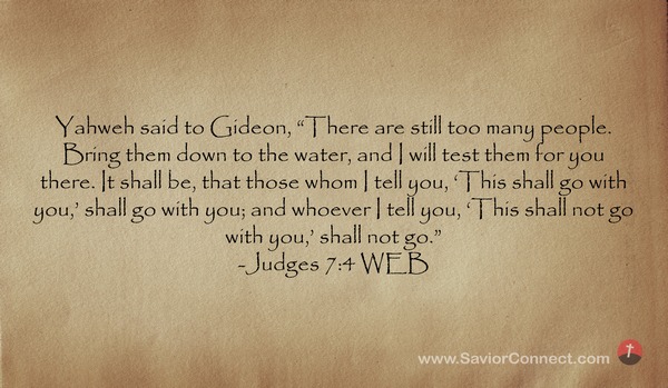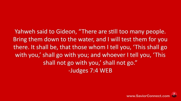 Yahweh said to Gideon, “There are still too many people. Bring them down to the water, and I will test them for you there. It shall be, that those whom I tell you, 'This shall go with you,’ shall go with you; and whoever I tell you, 'This shall not go with you,’ shall not go.” -Judges 7:4 WEB