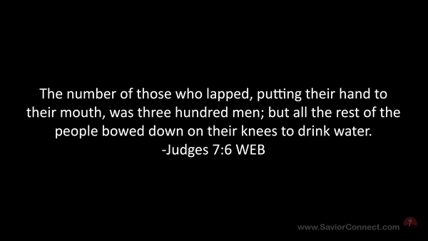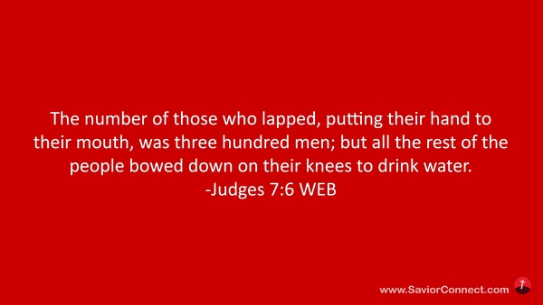 The number of those who lapped, putting their hand to their mouth, was three hundred men; but all the rest of the people bowed down on their knees to drink water. -Judges 7:6 WEB