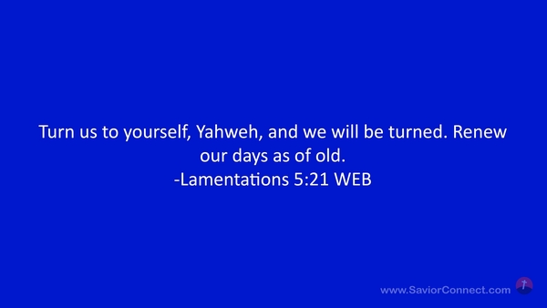 Turn us to yourself, Yahweh, and we will be turned. Renew our days as of old. -Lamentations 5:21 WEB