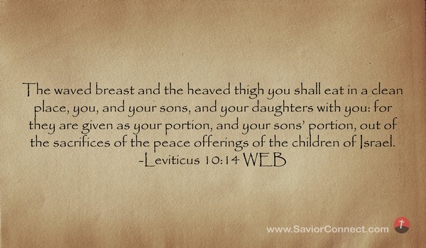 The waved breast and the heaved thigh you shall eat in a clean place, you, and your sons, and your daughters with you: for they are given as your portion, and your sons’ portion, out of the sacrifices of the peace offerings of the children of Israel. -Leviticus 10:14 WEB