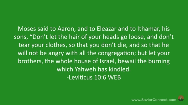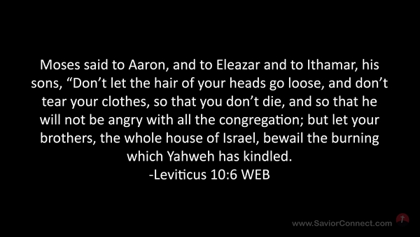 Moses said to Aaron, and to Eleazar and to Ithamar, his sons, “Don’t let the hair of your heads go loose, and don’t tear your clothes, so that you don’t die, and so that he will not be angry with all the congregation; but let your brothers, the whole house of Israel, bewail the burning which Yahweh has kindled. -Leviticus 10:6 WEB
