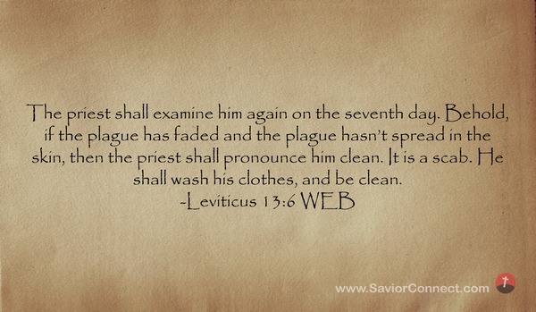 The priest shall examine him again on the seventh day. Behold, if the plague has faded and the plague hasn’t spread in the skin, then the priest shall pronounce him clean. It is a scab. He shall wash his clothes, and be clean. -Leviticus 13:6 WEB