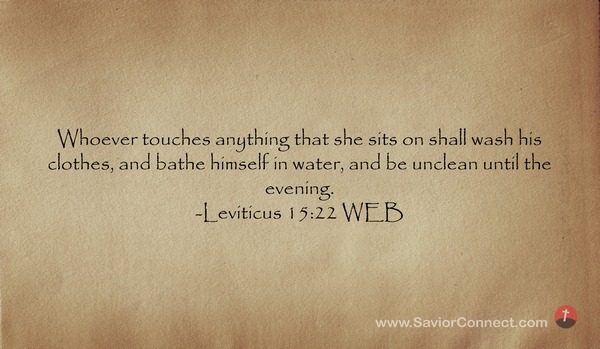Whoever touches anything that she sits on shall wash his clothes, and bathe himself in water, and be unclean until the evening. -Leviticus 15:22 WEB