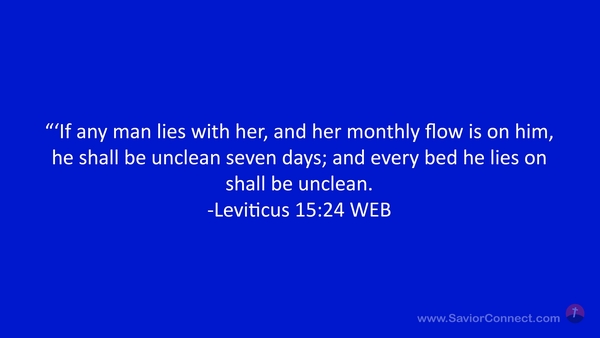 “'If any man lies with her, and her monthly flow is on him, he shall be unclean seven days; and every bed he lies on shall be unclean. -Leviticus 15:24 WEB