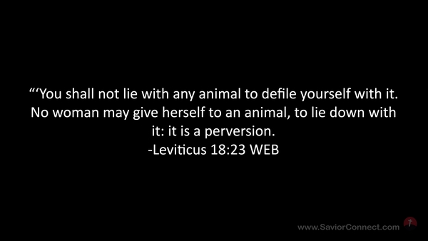 “'You shall not lie with any animal to defile yourself with it. No woman may give herself to an animal, to lie down with it: it is a perversion. -Leviticus 18:23 WEB