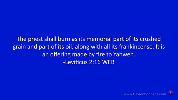 The priest shall burn as its memorial part of its crushed grain and part of its oil, along with all its frankincense. It is an offering made by fire to Yahweh. -Leviticus 2:16 WEB