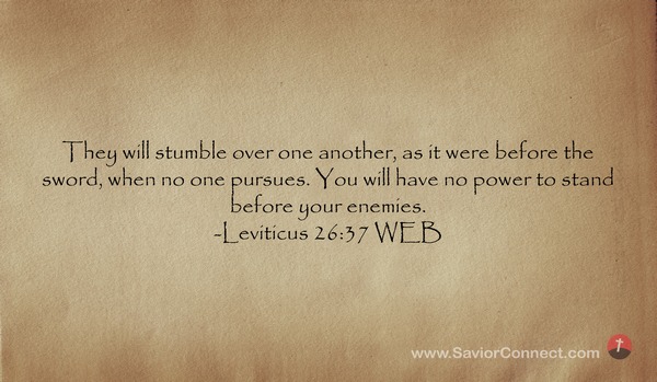 They will stumble over one another, as it were before the sword, when no one pursues. You will have no power to stand before your enemies. -Leviticus 26:37 WEB