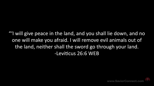 “'I will give peace in the land, and you shall lie down, and no one will make you afraid. I will remove evil animals out of the land, neither shall the sword go through your land. -Leviticus 26:6 WEB