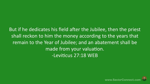 But if he dedicates his field after the Jubilee, then the priest shall reckon to him the money according to the years that remain to the Year of Jubilee; and an abatement shall be made from your valuation. -Leviticus 27:18 WEB
