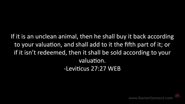 If it is an unclean animal, then he shall buy it back according to your valuation, and shall add to it the fifth part of it; or if it isn’t redeemed, then it shall be sold according to your valuation. -Leviticus 27:27 WEB