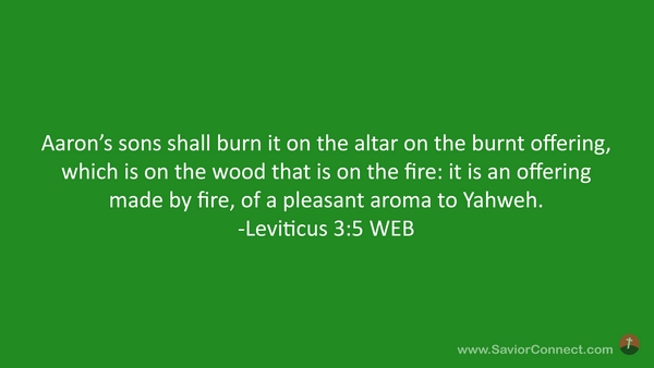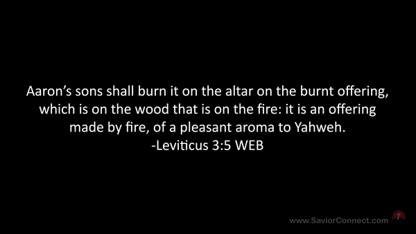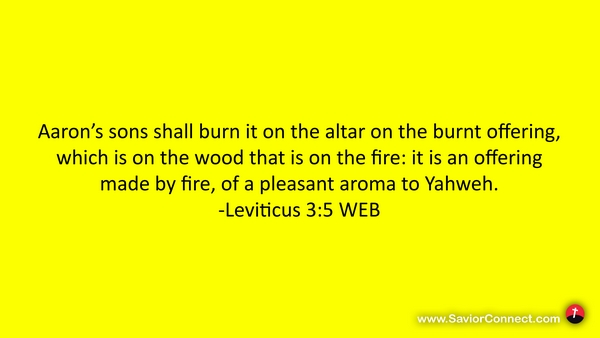 Aaron’s sons shall burn it on the altar on the burnt offering, which is on the wood that is on the fire: it is an offering made by fire, of a pleasant aroma to Yahweh. -Leviticus 3:5 WEB