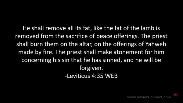 He shall remove all its fat, like the fat of the lamb is removed from the sacrifice of peace offerings. The priest shall burn them on the altar, on the offerings of Yahweh made by fire. The priest shall make atonement for him concerning his sin that he has sinned, and he will be forgiven. -Leviticus 4:35 WEB