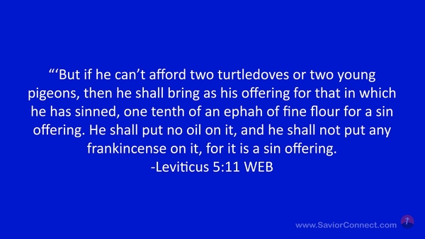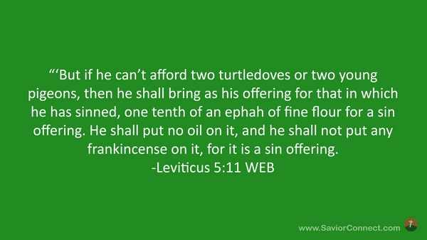 “'But if he can’t afford two turtledoves or two young pigeons, then he shall bring as his offering for that in which he has sinned, one tenth of an ephah of fine flour for a sin offering. He shall put no oil on it, and he shall not put any frankincense on it, for it is a sin offering. -Leviticus 5:11 WEB