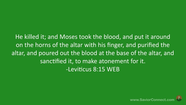 He killed it; and Moses took the blood, and put it around on the horns of the altar with his finger, and purified the altar, and poured out the blood at the base of the altar, and sanctified it, to make atonement for it. -Leviticus 8:15 WEB