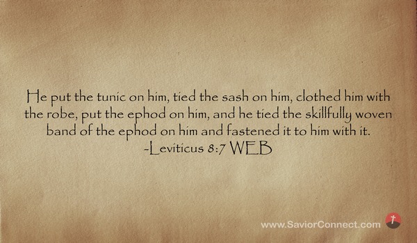 He put the tunic on him, tied the sash on him, clothed him with the robe, put the ephod on him, and he tied the skillfully woven band of the ephod on him and fastened it to him with it. -Leviticus 8:7 WEB