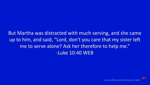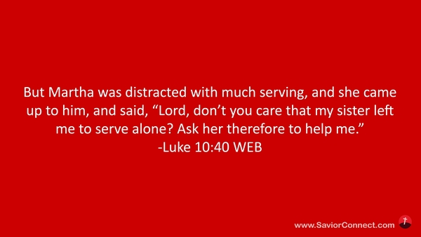 But Martha was distracted with much serving, and she came up to him, and said, “Lord, don’t you care that my sister left me to serve alone? Ask her therefore to help me.” -Luke 10:40 WEB