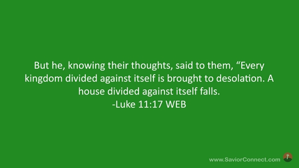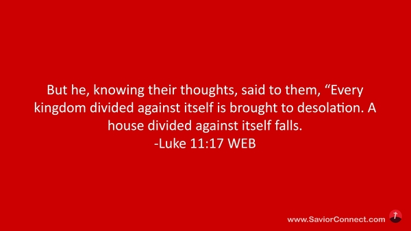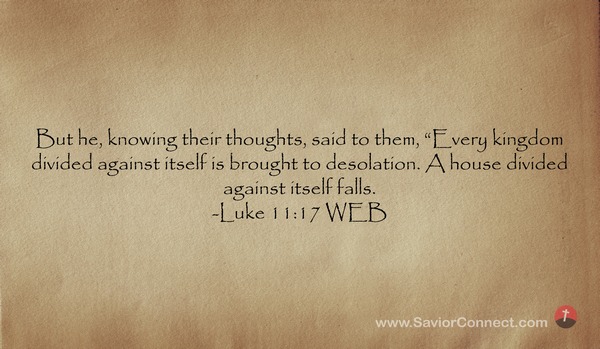 But he, knowing their thoughts, said to them, “Every kingdom divided against itself is brought to desolation. A house divided against itself falls. -Luke 11:17 WEB