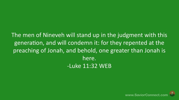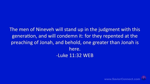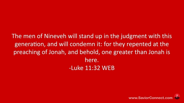 The men of Nineveh will stand up in the judgment with this generation, and will condemn it: for they repented at the preaching of Jonah, and behold, one greater than Jonah is here. -Luke 11:32 WEB