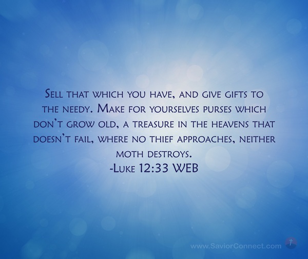 Sell that which you have, and give gifts to the needy. Make for yourselves purses which don’t grow old, a treasure in the heavens that doesn’t fail, where no thief approaches, neither moth destroys. -Luke 12:33 WEB