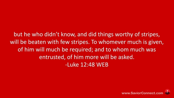 but he who didn’t know, and did things worthy of stripes, will be beaten with few stripes. To whomever much is given, of him will much be required; and to whom much was entrusted, of him more will be asked. -Luke 12:48 WEB