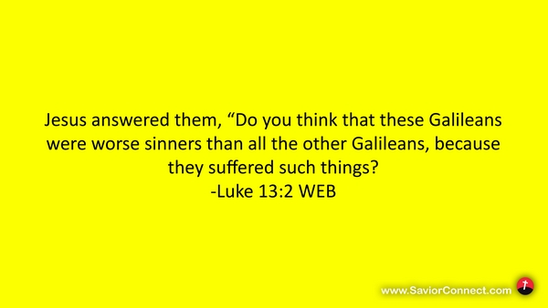 Jesus answered them, “Do you think that these Galileans were worse sinners than all the other Galileans, because they suffered such things? -Luke 13:2 WEB