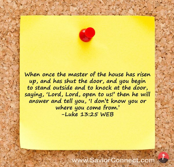 When once the master of the house has risen up, and has shut the door, and you begin to stand outside and to knock at the door, saying, 'Lord, Lord, open to us!’ then he will answer and tell you, 'I don’t know you or where you come from.’ -Luke 13:25 WEB
