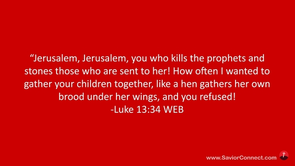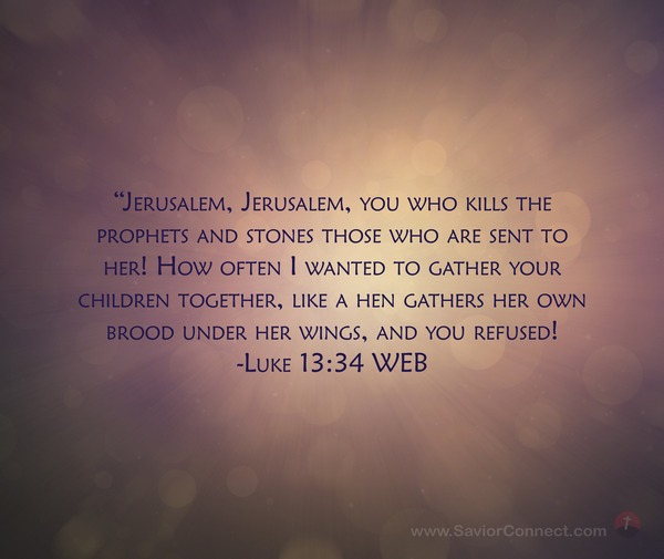 “Jerusalem, Jerusalem, you who kills the prophets and stones those who are sent to her! How often I wanted to gather your children together, like a hen gathers her own brood under her wings, and you refused! -Luke 13:34 WEB