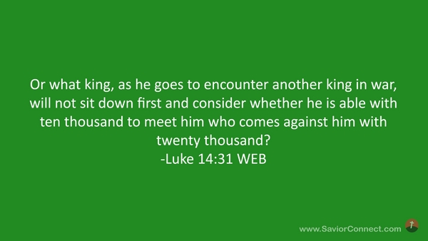 Or what king, as he goes to encounter another king in war, will not sit down first and consider whether he is able with ten thousand to meet him who comes against him with twenty thousand? -Luke 14:31 WEB