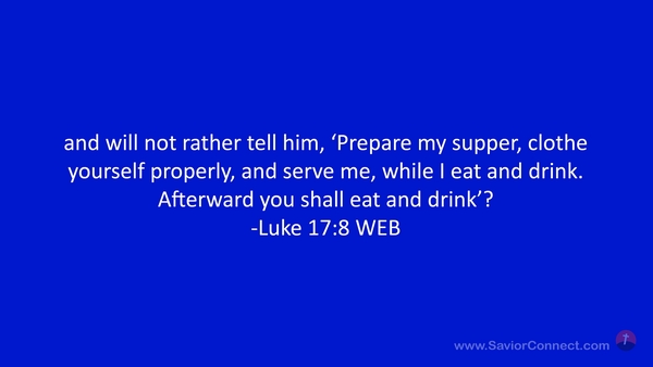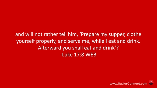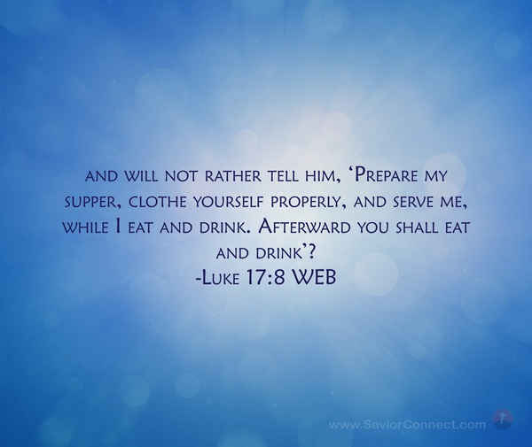 and will not rather tell him, 'Prepare my supper, clothe yourself properly, and serve me, while I eat and drink. Afterward you shall eat and drink’? -Luke 17:8 WEB