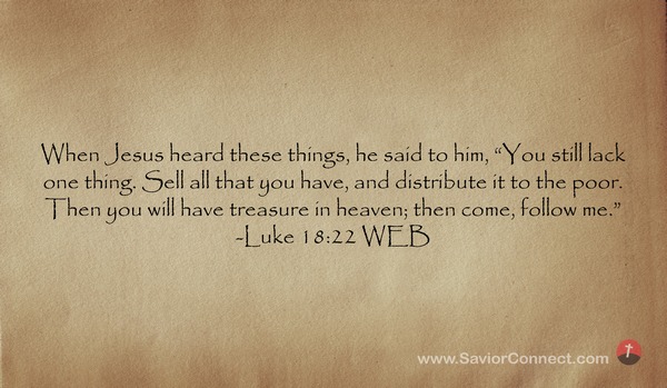 When Jesus heard these things, he said to him, “You still lack one thing. Sell all that you have, and distribute it to the poor. Then you will have treasure in heaven; then come, follow me.” -Luke 18:22 WEB