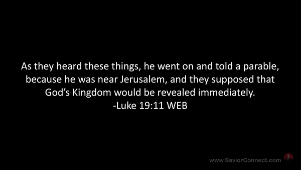 As they heard these things, he went on and told a parable, because he was near Jerusalem, and they supposed that God’s Kingdom would be revealed immediately. -Luke 19:11 WEB